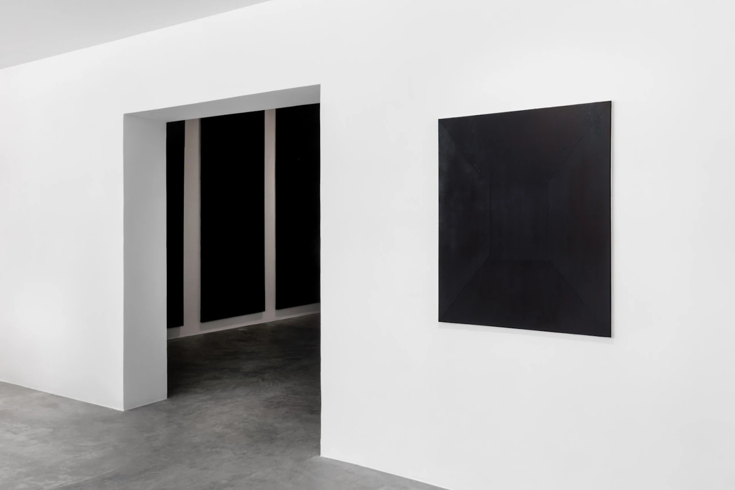 In this exhibition, Caio Carpinelli and Bruce Nauman inhabit the same field—not through aesthetic affinity, but through a tension that stretches space and time, raising questions about the place and capacity of the body. On one side, the series Chamber of Reflection (2025) by Caio Carpinelli: immense black surfaces composed of successive layers of paint and silence, where geometric forms appear as residual inscriptions embedded in the dense thickness of matter. The paintings seem to absorb everything around them—and yet they give something back, in a paradox woven between opacity and revelation. Like dark mirrors, they suggest both vortex and reflection, concealment and apparition, dissolution and genesis. Black here initiates an inverted void—an accumulation of gestures, decisions, frictions between pigment and water, between impact and settlement, between calculation and execution. Each work is the result of a process—physical, mental, and spiritual— lived intensely by the artist, who inscribes a type of suspended temporality into the pictorial field through his very handling of dark matter and his devotion to its mystery. From the depths of the void, however, light emerges once more, radically reprogramming reality as we know it.