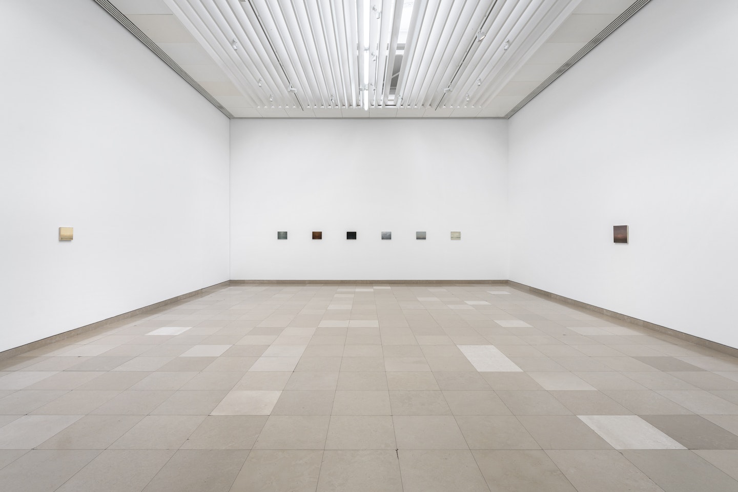 The artist has referred to this work as an “ideogram of landscape”, a minimal symbol, an abstraction distilled into its most elemental components to indicate a vision of the horizon. The upper square represents the sky—the realm of the ethereal, the imagined, the transcendental—while the lower square anchors itself in the earth, the material, the physical. The balance between the two, finely attuned to the tonal subtleties of the surrounding wall, invites the viewer into a moment of quiet revelation, as the work resists immediacy and demands prolonged observation. At first, it nearly fades; then, gradually, the eye adjusts, and its spectral presence is made perceptible, as well as the delicate difference of the quadrants. At this exact point, the artist finds a utopian equilibrium between reality and immateriality.